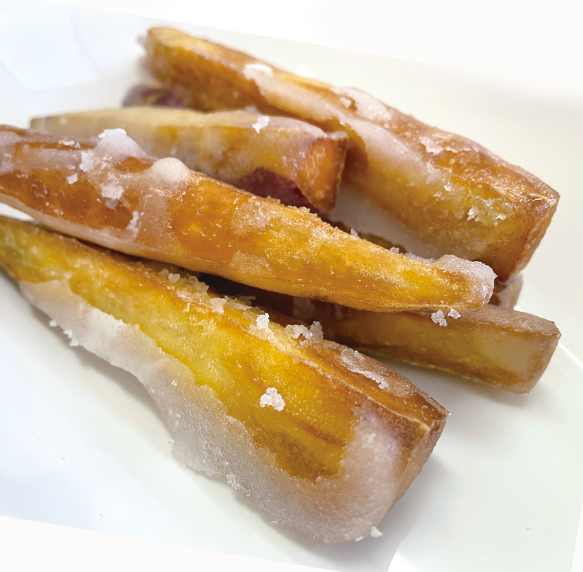 甘乃屋オリジナル新感覚のお芋スイーツ。やわらかい芋けんぴに砂糖をコーティングしてデラックスに仕上げました。昔なつかしい味、甘芋の決定版です。