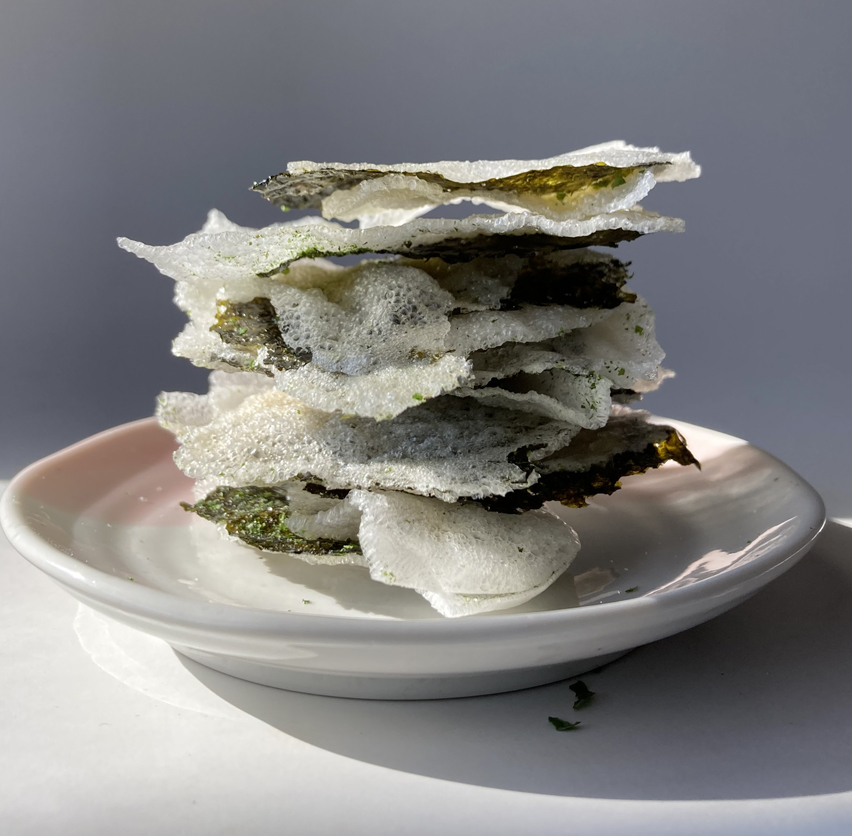 甘乃屋オリジナル、海苔米チップス。サクサクな食感とふんわり香る海苔の風味がたまらないチップスです。